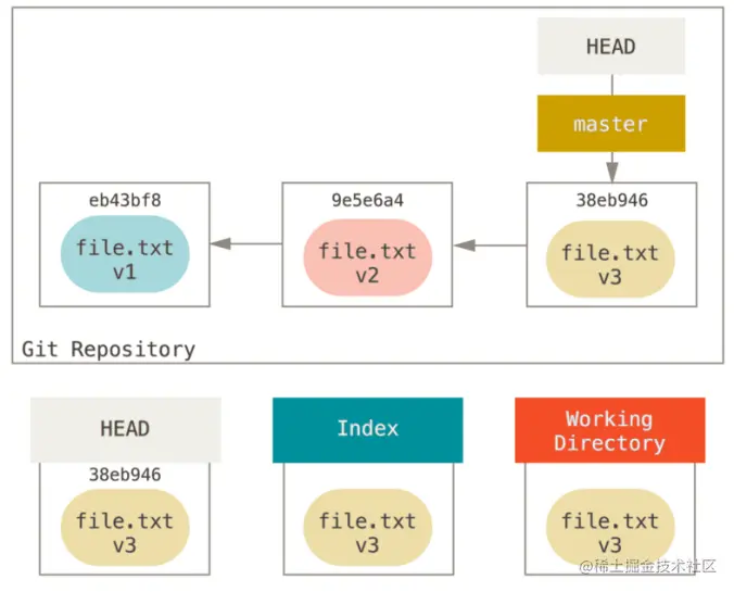 为了演示下面这些例子,假设我们修改了 file.txt 文件并第三次提交它。 现在的历史看起来是这样的:
