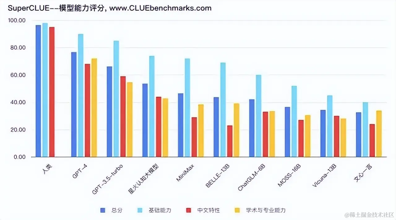 CLUE(Chinese Language Understanding Evaluation)是中文自然语言理解最权威测评榜单之一,包含了文本分类、阅读理解、句间关系等众多语义分析和语义理解类子任务。SuperCLUE是其针对中文可用的通用大模型的一个测评基准。
