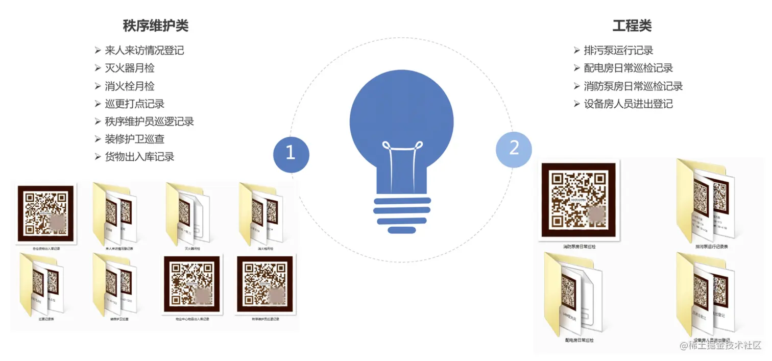 除了外来车辆登记二维码外,红豆物业在其他工作中也应用到了二维码,项目上目前正在使用的有两大类应用,分别是秩序维护类和工程类,其中涵盖了巡更打点记录、装修护卫巡查、消防设施器材月检、设施设备用房巡检等多个方面。
