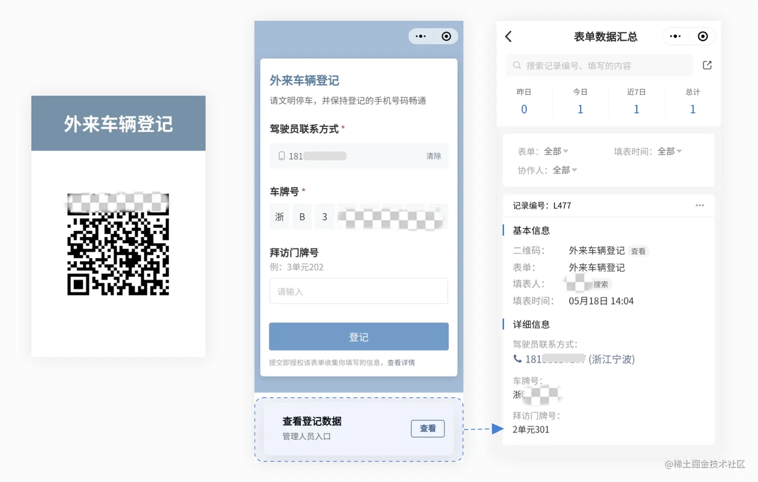 当外来车辆进入小区时,车主需要在小区门口扫码登记自己的车牌号、所访问单元的门牌号以及有效的驾驶员联系方式,一方面形成了档案,能够让物业方了解车主的去向;另一方面如果外来车辆不小心占用到了业主的车位或者消防通道时,物业方就可以在手机上直接查找到这个车牌号对应的车主手机号并及时联系车主挪车。