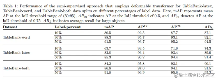 实验提供了对不同比例的标签数据的表库数据集的所有分割的实验结果。还比较了基于transformer的半监督方法与以前的基于深度学习的监督和半监督方法。此外,实验给出了10%标记数据的TableBank-both数据集在所有IoU阈值下的结果。表1提供了半监督方法在TableBank-latex, TableBank-word, 和TableBank-both数据集,分别10%、30%和50%标记数据时的实验结果。它表明,在10%标记数据时,TableBank-both数据集的AP50值最高,为95.8%,TableBank-latex为93.5%,TableBank-word有92.5%。