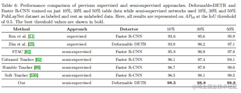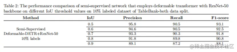 表3比较了ResNet-50主干上基于深度学习的监督网络和半监督网络。还将在10%、30%和50%TableBank-both数据集标签数据上训练的监督可变形DETR与使用可变形transformer的半监督方法进行了比较。结果表明,基于attention机制的半监督方法使用候选生成过程和后处理步骤,如非最大抑制(NMS),取得了可观的结果。
