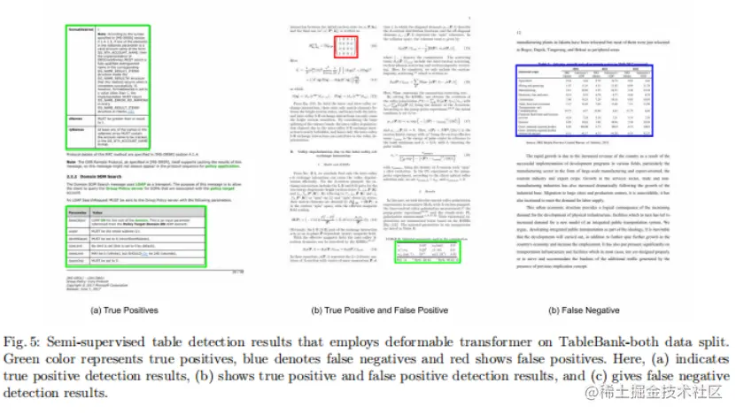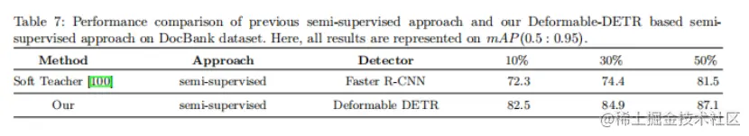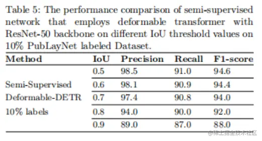 表6比较了使用ResNet-50骨干网的PubLayNet表类上基于深度学习的监督网络和半监督网络。还比较了在10%、30%和50%的PubLayNet表类标签数据上训练的有监督的可变形detr与使用可变形transformer的半监督方法。它表明,半监督方法不使用候选和后处理步骤,如非最大抑制(NMS),提供了有竞争力的结果。