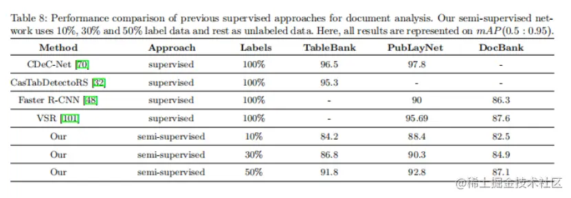 此外,还比较了表8中对不同比例的标记数据的半监督方法与之前针对不同数据集的表格检测和文档分析方法。虽然不能直接比较作者的半监督方法与以前的监督文档分析方法。然而,可以观察到,即使有50%的标签数据,作者也获得了与以前的监督方法类似的结果。