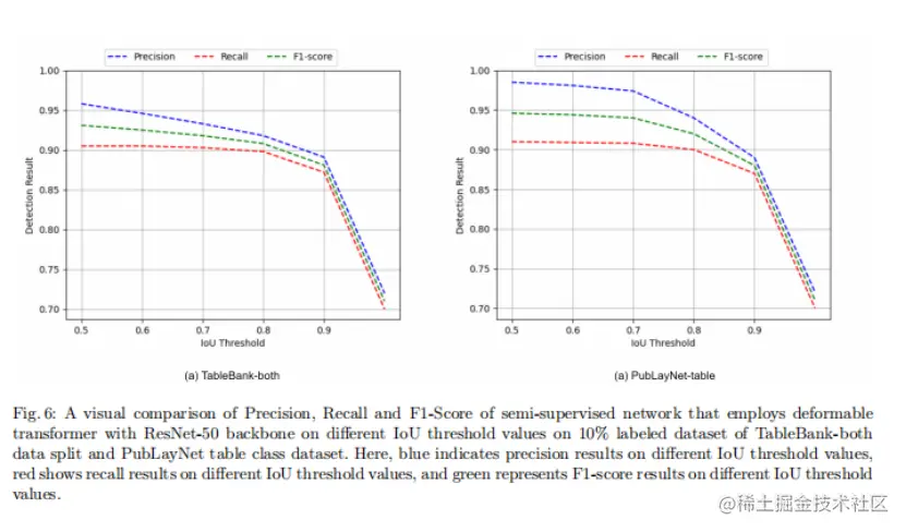 此外,半监督网络在10%的标记的PubLayNet数据集上,在不同的IoU阈值上进行训练。表5给出了半监督方法对10%标记数据上的PubLayNet表类的不同IoU阈值的结果。在PubLayNet表类的10%标记数据集上,在不同的IoU阈值上使用具有ResNet-50主干的可变形transformer网络的半监督网络的准确率、召回率和f1-score的可视化比较如图6(b)所示。这里,蓝色表示不同IoU阈值的准确率结果,红色表示不同IoU阈值的召回结果,绿色表示对不同IoU阈值的f1-score结果。