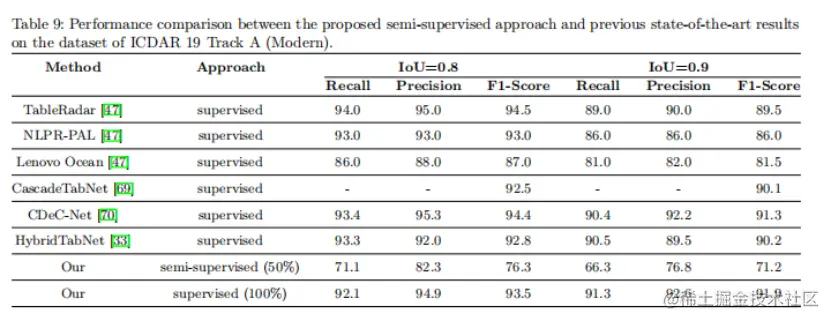 实验还评估了在Modern Track A数据集上的表格检测方法。作者总结了该方法在不同百分比的标签数据下的定量结果,并将其与表9中以前的监督表格检测方法进行了比较。在更高的IoU阈值0.8和0.9下评估结果。为了与以前的表格检测方法进行直接比较,作者还在100%的标签数据上评估了论文的方法。论文方法在100%标签数据的IoU阈值上获得了92.6%的准确率和91.3%的召回率。