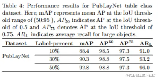 实验讨论了在PubLayNet表类数据集上对不同标记数据百分比的实验结果。还比较了基于transformer的半监督方法与以前的基于深度学习的监督和半监督方法。此外,实验给出了10%标记数据的PubLayNet数据集上的所有IoU阈值的结果。表4提供了半监督方法的结果,该方法对PubLayNet表类数据使用可变形transformer来处理标记数据的不同百分比。在这里,10%、30%和50%的标记数据的AP50值分别为98.5%、98.8%和98.8%