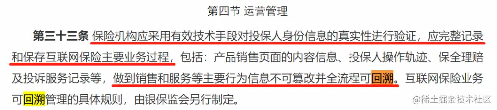 2020年12月,银保监会发布《互联网保险业务监管办法》(自2021年2月1日起施行)。明确“保险机构应采用有效技术手段对投保人身份信息的真实性进行验证,应完整记录和保存互联网保险主要业务过程,包括:产品销售页面的内容信息、投保人操作轨迹、保全理赔及投诉服务记录等,做到销售和服务等主要行为信息不可篡改并全流程可回溯。 ”