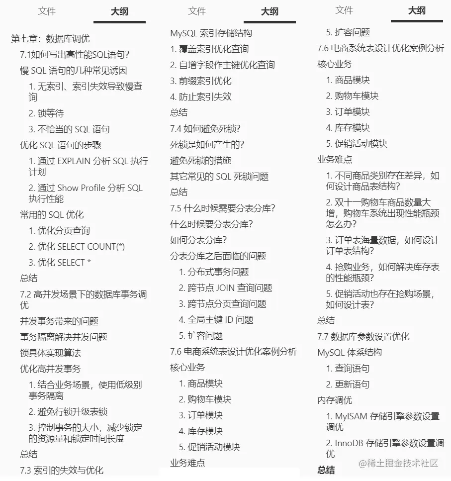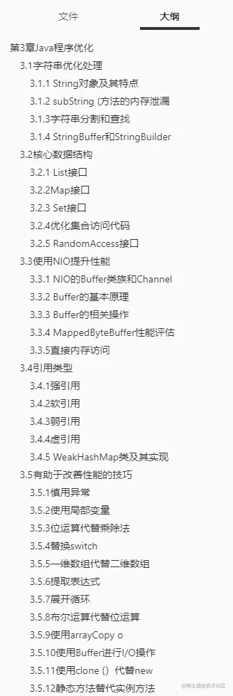 总之,一旦遇到“性能优化”问题,很少人能够由点及面逆向分析,最终找到瓶颈点和优化方法,而性能优化是软件工程的深水区,也是衡量一个程序员能力高低的标准。 俗话说:“授人以鱼不如授人以渔”。在这分享这份性能调优实战手册及配套视频给有需要的小伙伴,希望对大家的学习进阶会有较大的帮助!由于篇幅原因,本文只展示了目录和内容截图,有需要学习性能调优的小伙伴只需——【戳一戳】即可免费领取