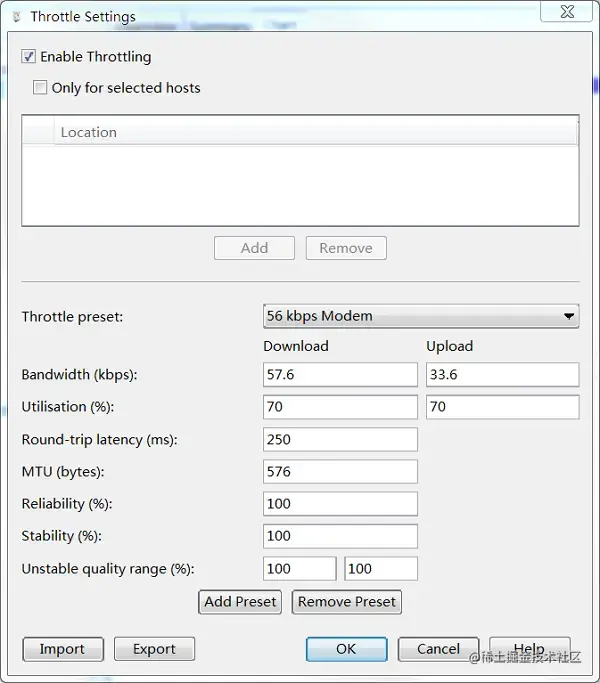 勾选 Enable Throttling 启用网速模拟配置,在 Throttle Preset 下选择网络类型即可,具体设置可以根据实际情况自行设置。如果只想模拟指定网站的慢速网络,可以再勾选上图中的 Only for selected hosts 项,然后在对话框的下半部分设置中增加指定的 hosts 项即可。