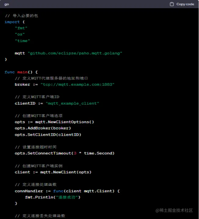 以上示例代码展示了如何使用Go语言连接和使用MQTT协议的设备。首先,我们定义了MQTT代理服务器的地址和端口,以及MQTT客户端ID。接着,我们创建了MQTT客户端选项并设置了连接超时时间。通过调用Connect方法,我们连接到MQTT代理服务器。 在连接成功后,我们定义了订阅的主题和消息接收处理函数。通过调用Subscribe方法,我们订阅主题并设置消息处理函数。 最后,我们通过一个无限循环等待消息的方式保持连接。你可以根据需求在循环中添加其他逻辑处理接收到的消息。 通过以上代码示例,我们展示了如何使用Go语言连接和使用MQTT协议的设备。这为物联网应用的开发提供了一个简单而强大的工具。通过使用Go语言的并发特性,我们能够轻松地处理大规模的设备通信和数据传输。无论是开发智能家居系统、工业自动化还是物联网解决方案,使用Go语言和MQTT协议能够帮助我们构建高效可靠的物联网应用。