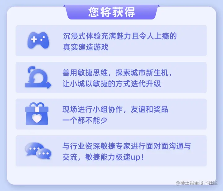 本次“城市之光”计划将以“规划并建造一座城市”为目标,通过团队协作从0到1建造城市,将建造游戏微观管理与敏捷项目管理融为一体,用游戏的方式打破人际边界,在游戏中实现知识的获取、经验的总结与复用。