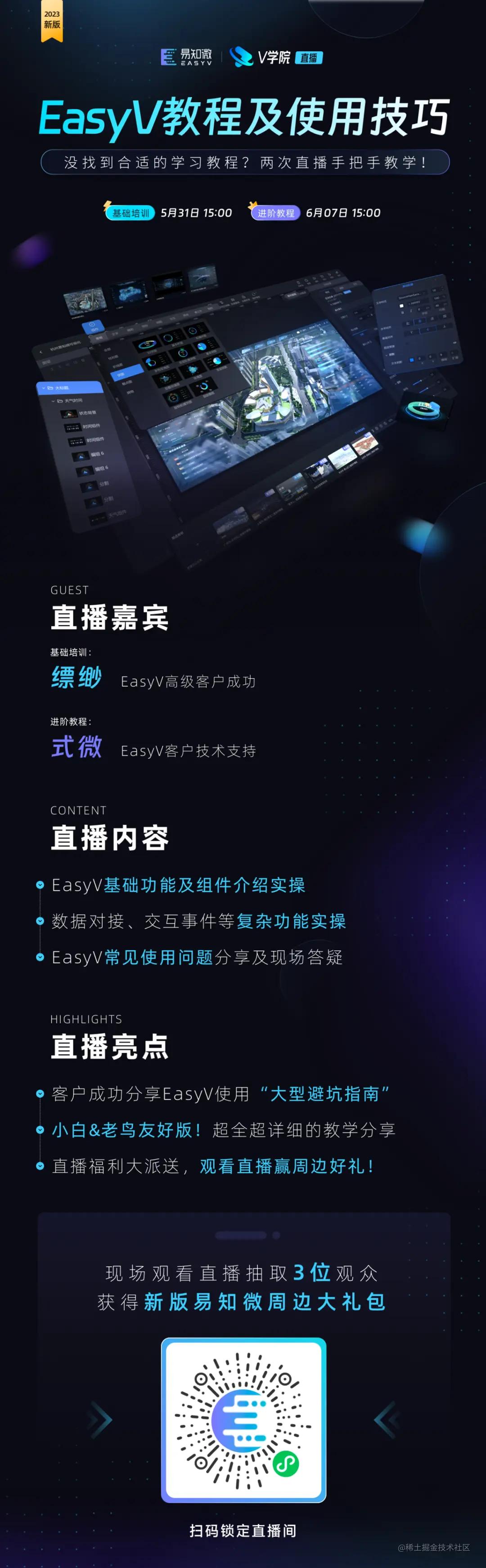 为了解答大家的疑惑,通过两期 V 学院直播分享带大家从基础到进阶完整学习,我们邀请到了 EasyV 高级客户成功缥缈和技术支持式微**,详细解析 EasyV 产品教程及使用技巧,同时也为大家介绍最新的产品能力及服务。**