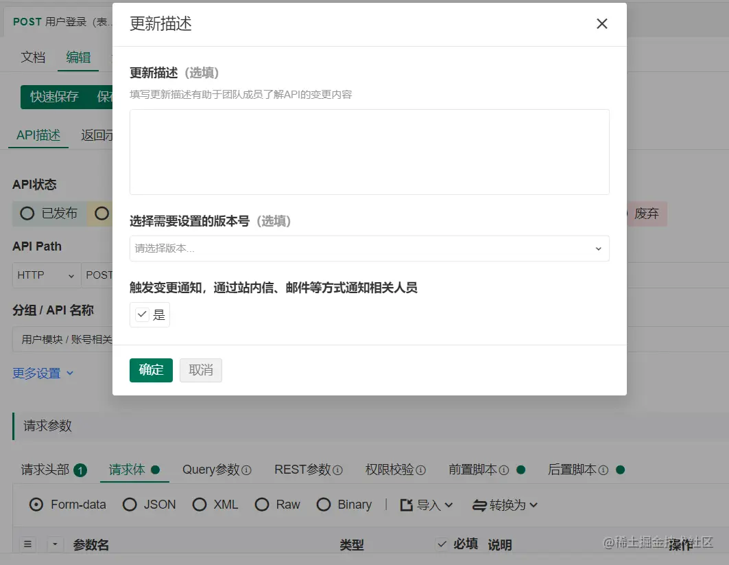 除此之外,还可将API设置为已发布、设计中、待确定、开发、对接、测试、完成、异常、维护发、废弃等状态,可根据每种状态设置状态变更操作,如当API变为测试状态时测试人员,当然,状态发生改变或改变接口本身时,也可以手工选择需要通知的人员。如下图所示,当更新接口状态时,不仅需要更新相关变更信息,而且还可以选择是否触发变更通知。