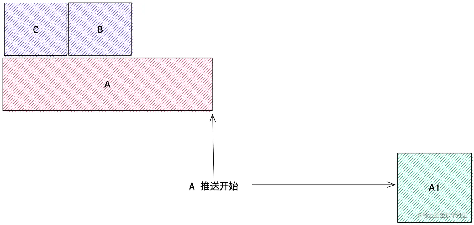 稍微想一下就知道这样是有问题的,假设有三个事件 A、B、C,分别对应到三个版本的数据A1、B1、C1,A 最先到达,在 A 开始推送后但没完成时 B、C 事件到达,A 事件触发推送了 A1 版本的数据,B、C 事件在 A 事件推送完成后,直接丢弃,最终推送到消费者上的数据版本为 A1,但我们肯定期望推送的数据版本为 C1,画个图线感受下: