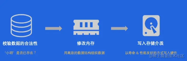 首先校验数据的合法性、然后在内存中用高效的数据结构组织数据、最后将数据以寿命&性能友好的方式写入存储介质