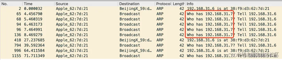 可以发现根本没有三次握手的包,只有一些 ARP 包,在询问“谁是 192.168.31.7。