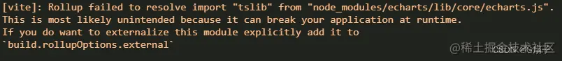 Rollup failed to resolve import “tslib“ from “node_modules/echarts/lib/core/echa G扇子 2023-05-19 351 阅读1分钟 在HBuilderX中下载eharts插件然后引入eharts之后出现了这几个错误: 编辑 以上这个问题直接通过pnpm i tslib 或者 npm i tslib 即可解决 编辑 以上这个问题直接通过pnpm i zrender 或者 npm i zrender 即可解决