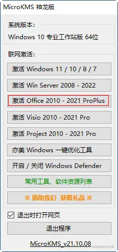 打开 MicroKMS_v21.10.08_Beta.exe,点击激活 0ffice 2021-2021 ProPlus