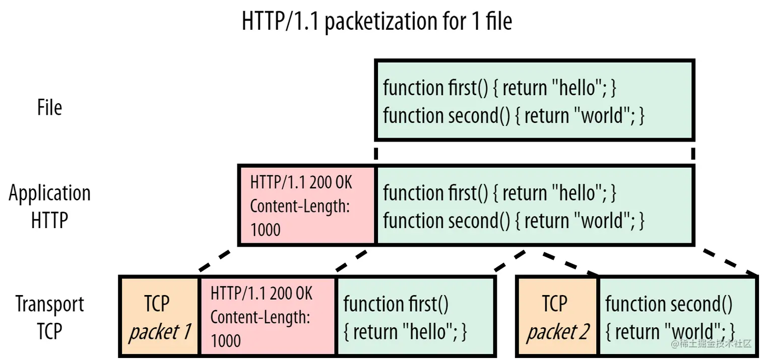 由于HTTP1.1是纯文本协议,只通过Header中的Content-Length来判断资源大小,不会进一步区分单个大块资源与其他资源。所以在一个链接上会一个一个完整的传输资源,如果前面的资源创建缓慢或者过大,会导致队头阻塞问题。这是HTTP协议导致的队头阻塞