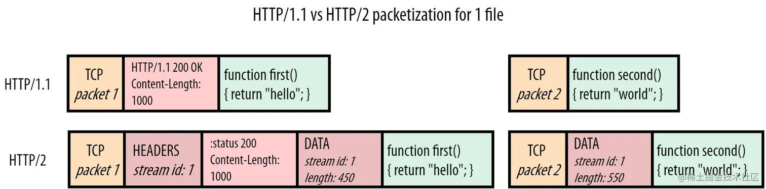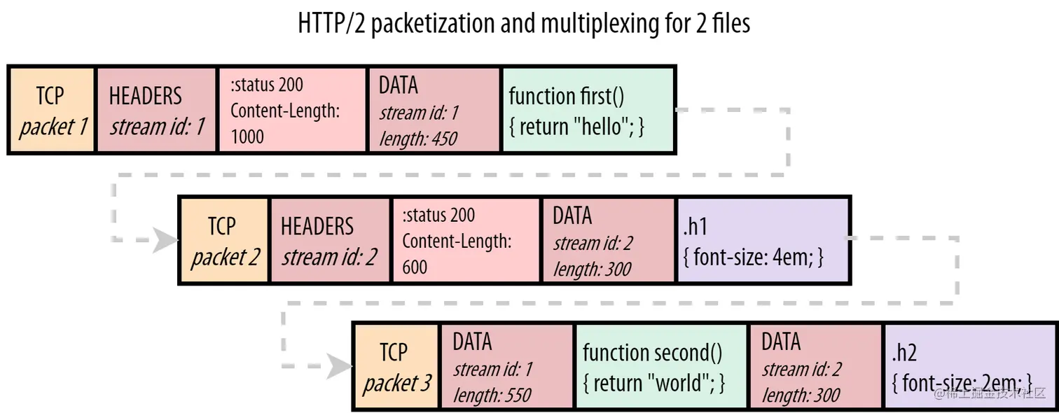 HTTP1.1中导致队头阻塞是因为在资源块(resource chunks)之间没有分隔符和标识符,只能打开多个并行链接来解决。而在HTTP2.0中在单个TCP链接上解决了队头阻塞的问题,在资源块前面加上了帧(frames)。