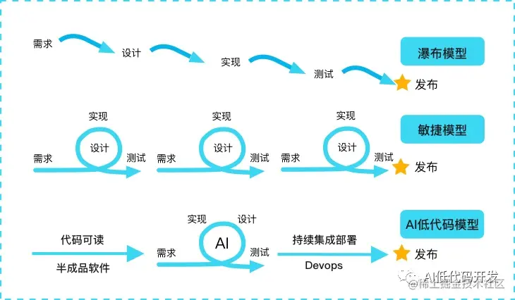 从上述经典的软件开发过程模型中可以看出,瀑布模型是作为基础模型的存在,敏捷模型则是以增量模型和原型模型为基础发展而来的。AI低代码开发过程模型则是进一步建立在原型模型和敏捷模型之上,主要思想是在已有软件的基础上通过AI的能力更加快速的迭代并利用自动化的工具来完成开发。 其具体流程分为以下三步: