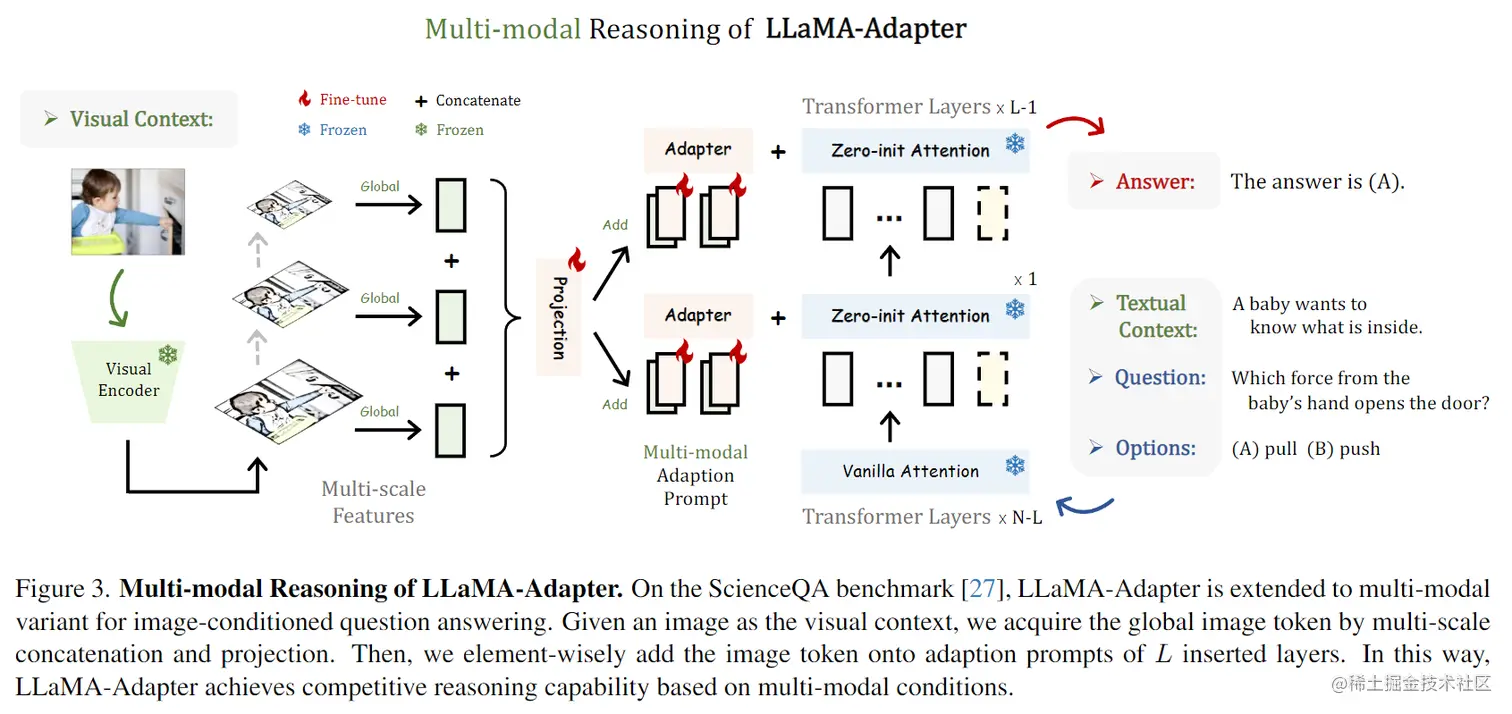 上图展示了LLaMA-Adapter在处理多模态输入上的框架图,在 ScienceQA 基准测试上,可将LLaMA-Adapter扩展为图像问答模式,在给定的图像视觉上下文中,通过多尺度连接和投影来获取全局图像 token。然后对插入层L的适应提示逐元素加上图像 token。通过这种方式,LLaMA-Adapter 模型在基于多模态输入下实现了有竞争力的生成结果。