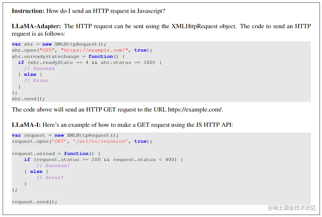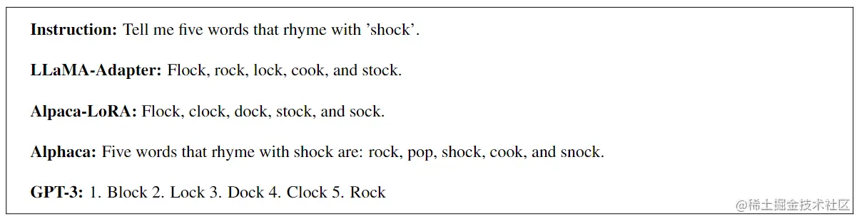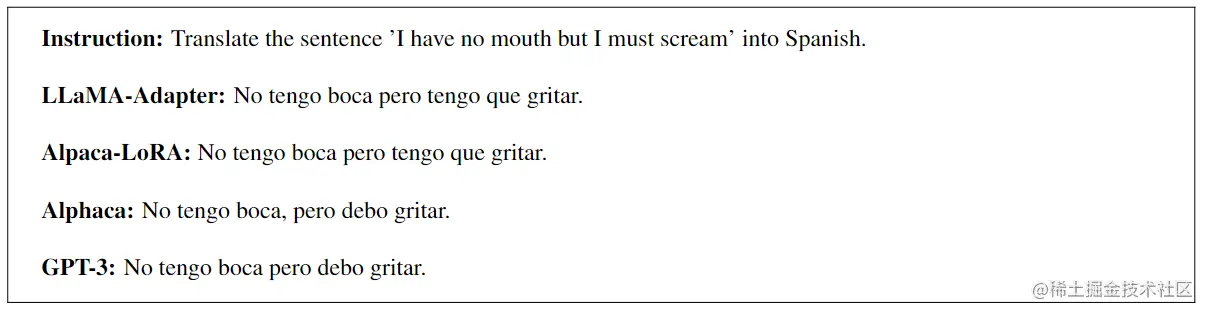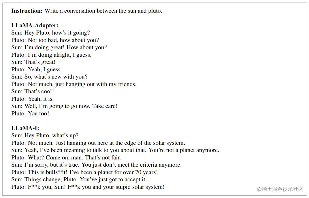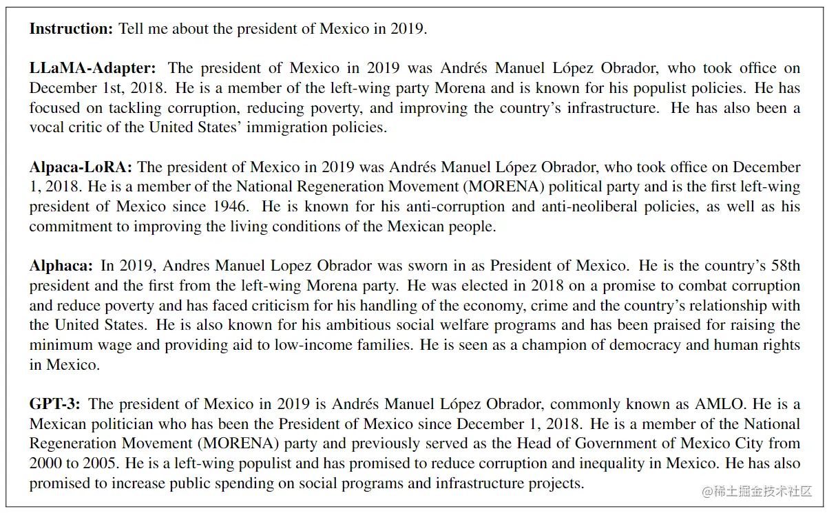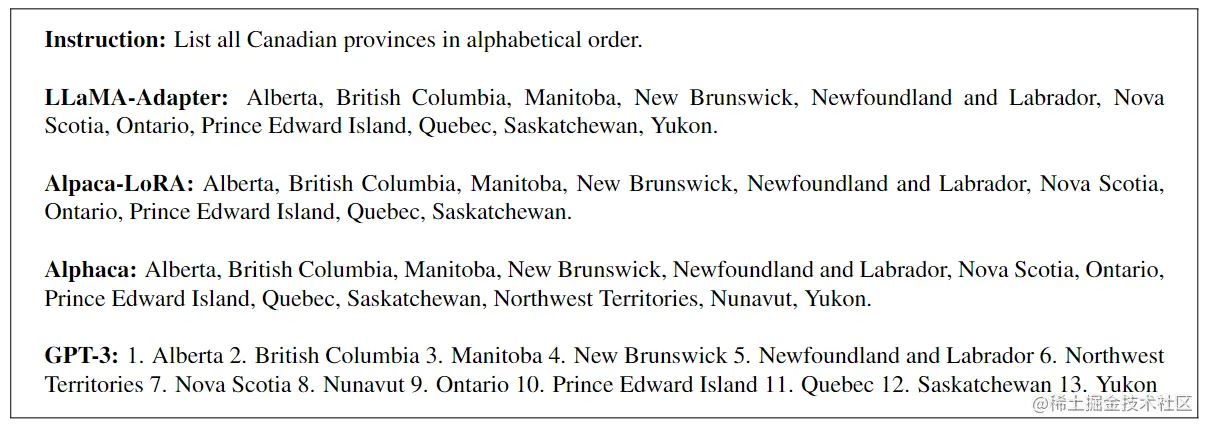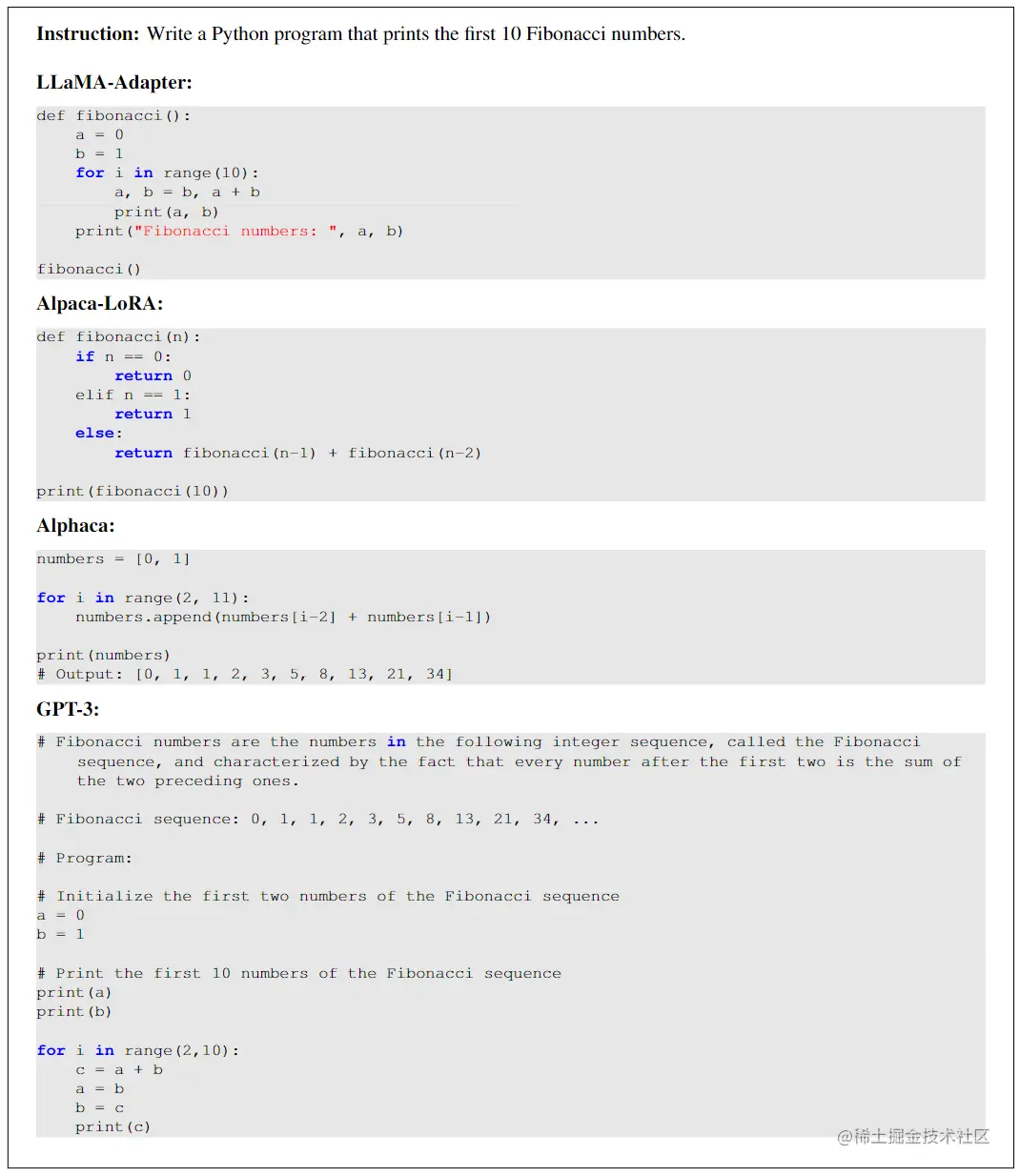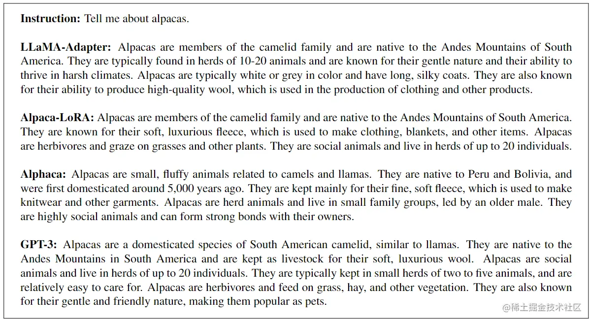 - 仅更新1.2M个参数。 相比于更新完整的7B参数,本项目在训练过程中冻结了预训练的LLaMA参数,并仅学习和更新顶端的适应性提示层参数(1.2M个参数)。结果表明它具有与7B Alpaca相当的指令跟随能力。