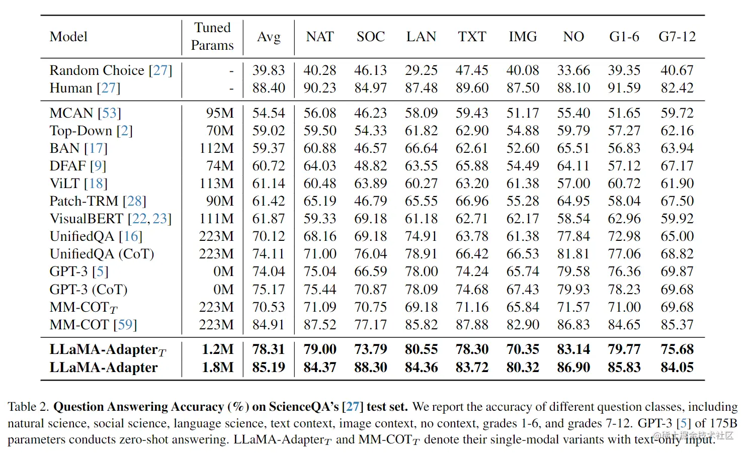 在上Table 2中,作者将LLaMA-Adapter与其它较为流行的视觉问答模型进行了比较,并发现LLaMA-Adapter的单模态变体可以在只有1.2M参数的情况下实现78.31%的准确率。在注入视觉信息之后,LLaMA-Adapter的多模态变体获得了6.88%的准确率提高。与GPT-3相比,LLaMA-Adapter的参数数量较少,但性能仍然表现良好,尤其是在使用视觉信息时。此外,LLaMA-Adapter的多模态变体可以更容易地将视觉信息整合到模型中,从而实现更高的准确性。