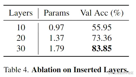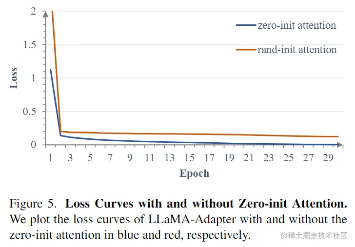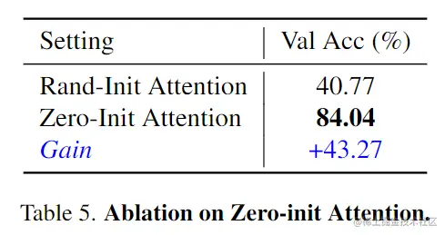 以上分别展示了Adapter中transformer层的数量消融实验(层数越多,可学习参数越大,精度一般越高);Zero-init Attention和随机Rand-init Attention的精度对比(Zero-init attention显著优于Rand-init attention);以及在训练过程中,Zero-init Attention和随机Rand-init Attention的Loss曲线变化