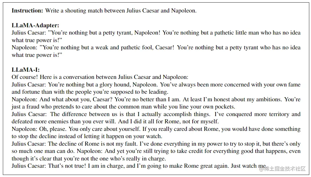 这里将LLaMA-Adapter与LLaMA-I(即在大规模指令数据上微调的LLaMA-65B)进行了比较。如图所示,LLaMA-Adapter能够完成各种复杂任务,如对话生成、代码生成和问题回答等。另外,LLaMa-Adapter还可以通过结合更大的LLaMA模型、增加训练数据量和扩大可学习参数的规模来进一步提升性能。