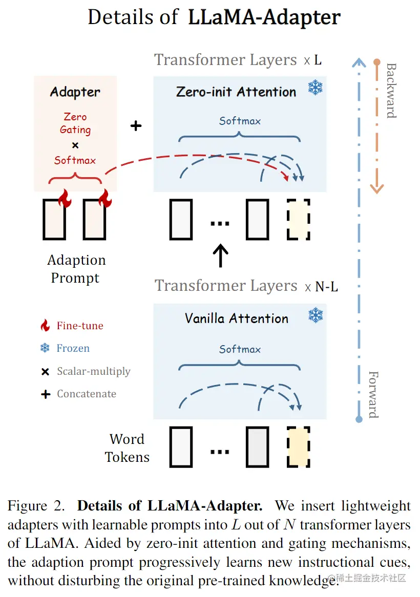 相比全微调的Alpaca模型,LLaMA-Adapter提高了资源利用率。具体而言:在LLaMA较高的transformer层中,添加一组可学习的适应性提示作为前缀prefix,以注入新的指令到LLaMA中。为了避免在早期训练阶段来自适应提示的噪声,作者修改了插入层的vanilla注意机制,将其作为可学习的门控因子进行零初始化。将门控因子通过零向量初始化,可以保留LLaMA中的原始知识,并在训练期间逐步融入指令信号。这有助于稳定学习过程,并提高最终模型的指令跟随能力。