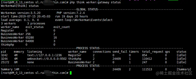 - 可能启动成功,输入 php think worker:gateway status 查看进程的信息。