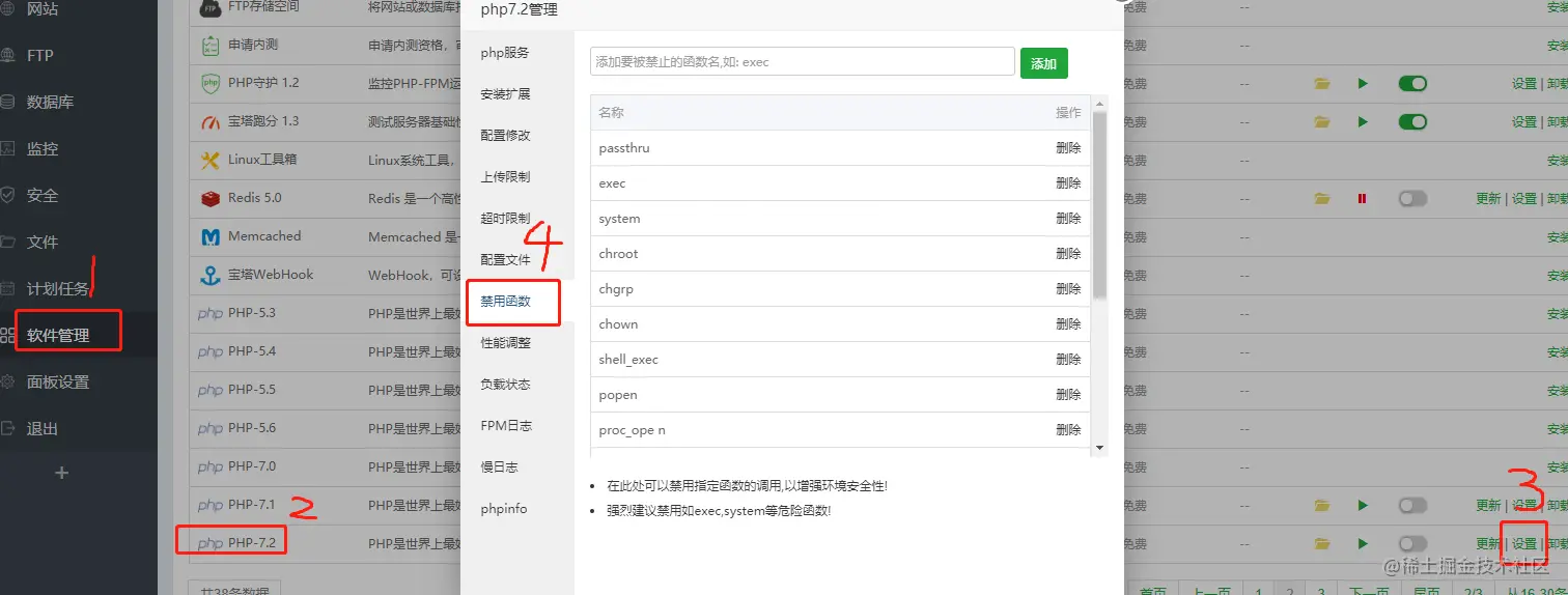 方法:找到运行的PHP版本的php.ini ,禁用函数stream_socket_server去除,宝塔操作如下。