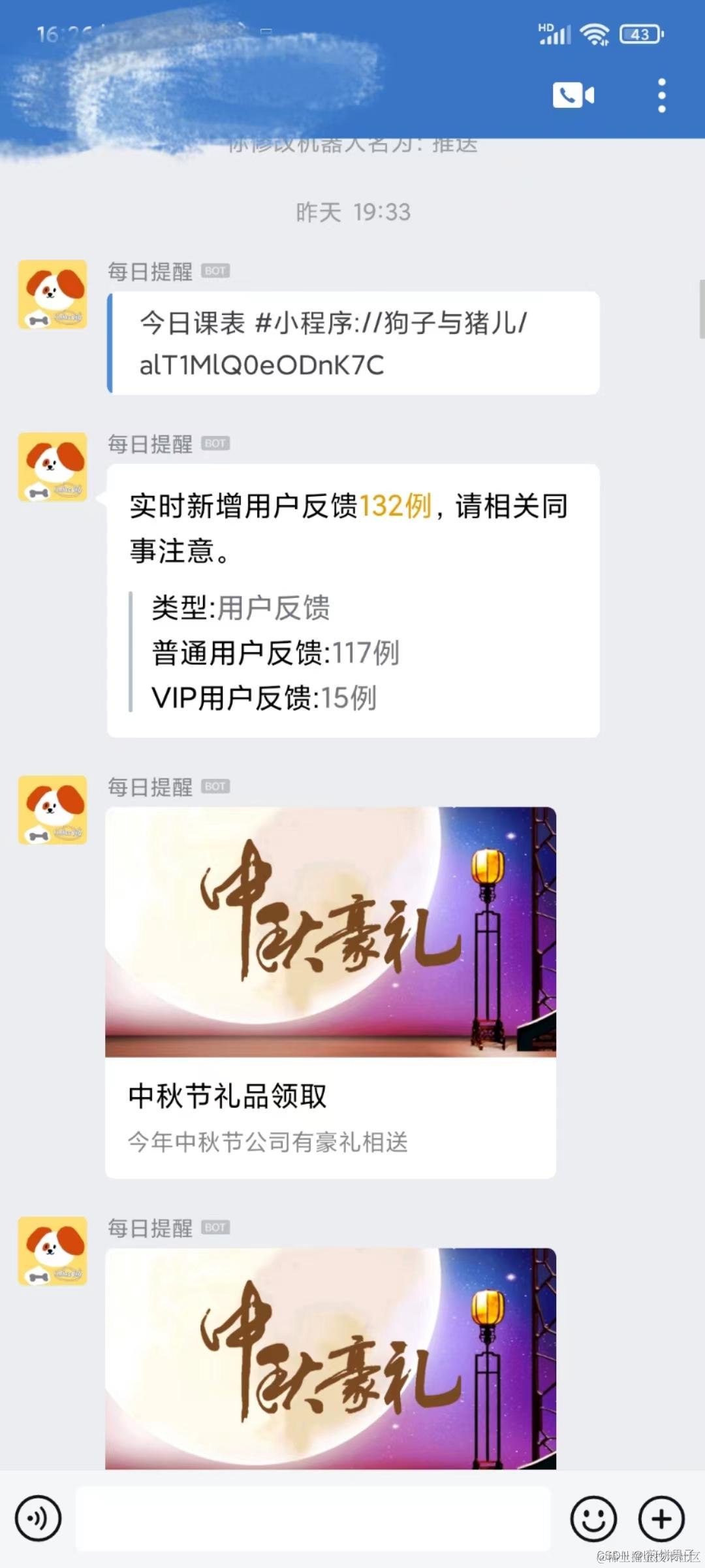 最近在研究给女朋友推送每日课表,一开始是使用 微信公众号接口测试号 来推送的,但是现在公众号消息展示改了,不会显示在消息列表,而是隐藏在“订阅号消息”里面,不仔细看都看不到,很容易被忽略,如下图: