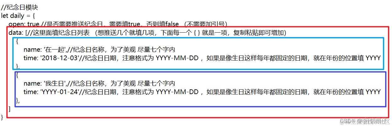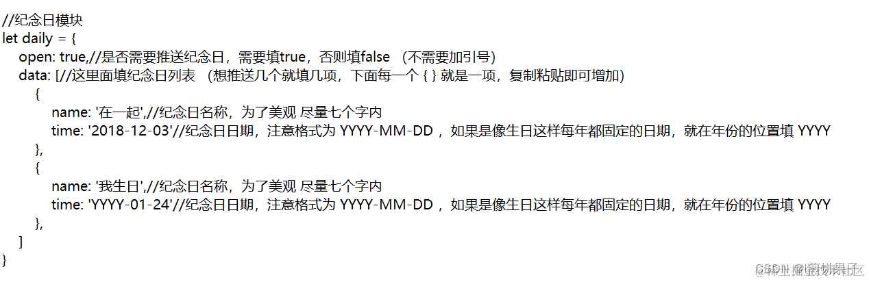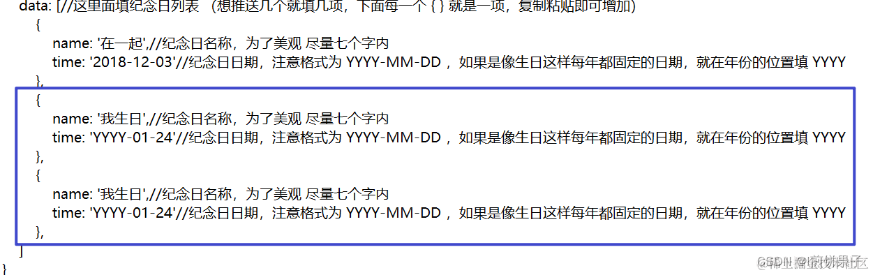 然后输入纪念日列表,这里提供了两个示例 (一个大括号 { } 包裹的是一个示例,每个大括号的后面要加英文逗号 )
