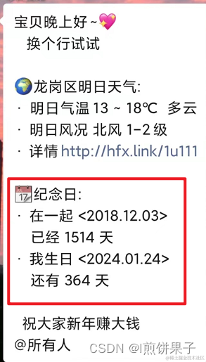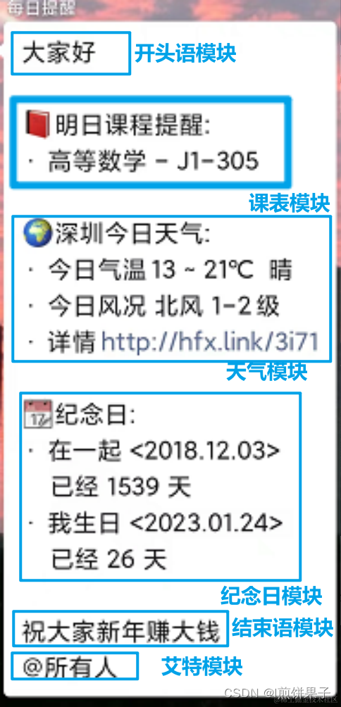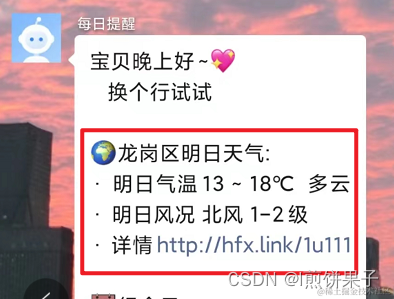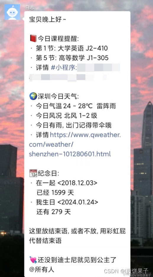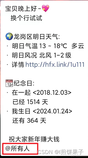 本文到此结束,如果想知道推送详细代码和原理的,可以查看我另一篇文章 :超详细 企业微信推送每日天气或课表(所有东西都可推送)_l煎饼果子的博客