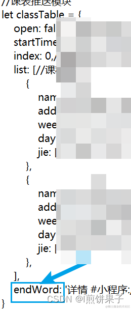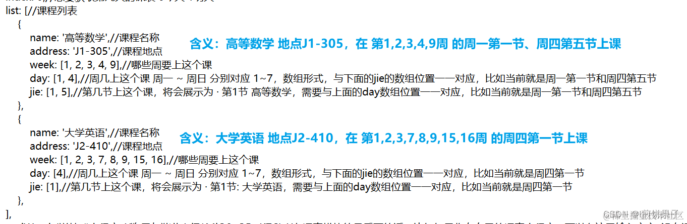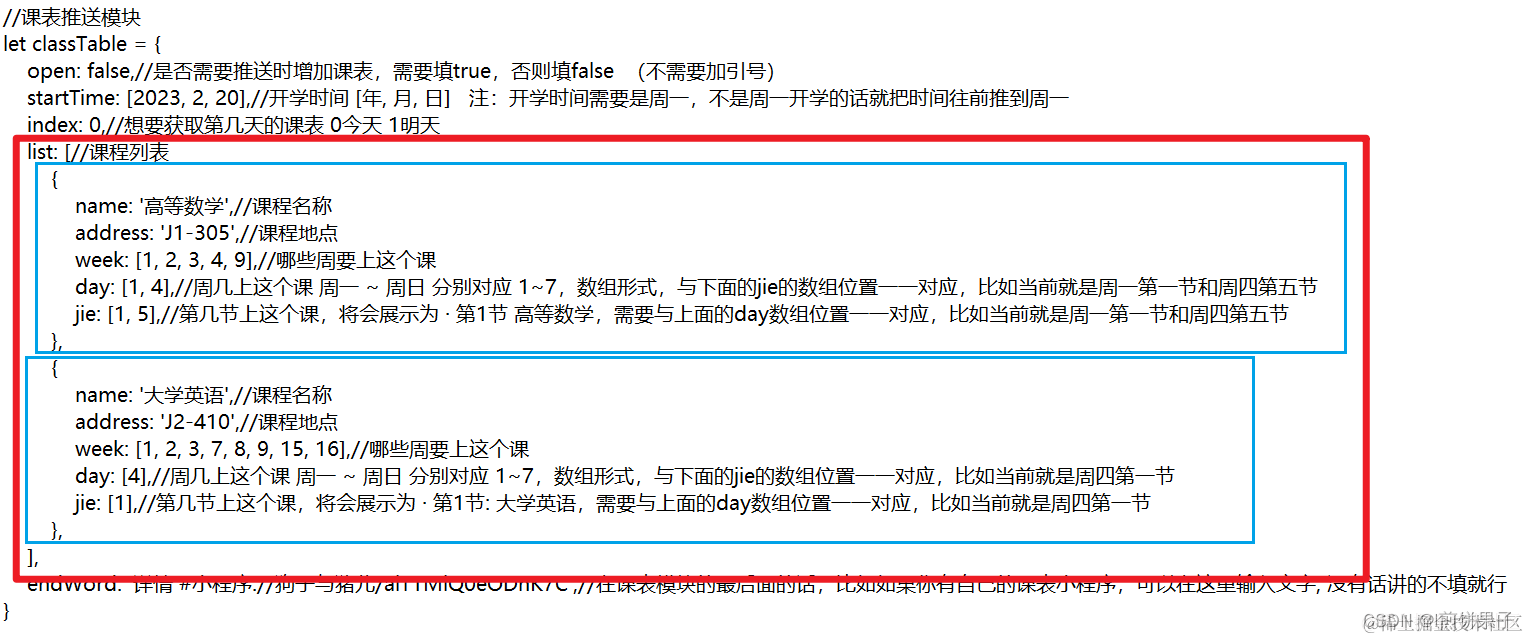 下图给了两个示例,可以自行添加更多数据 (一个蓝色框就是一个课程数据,复制粘贴之后改内容即可)