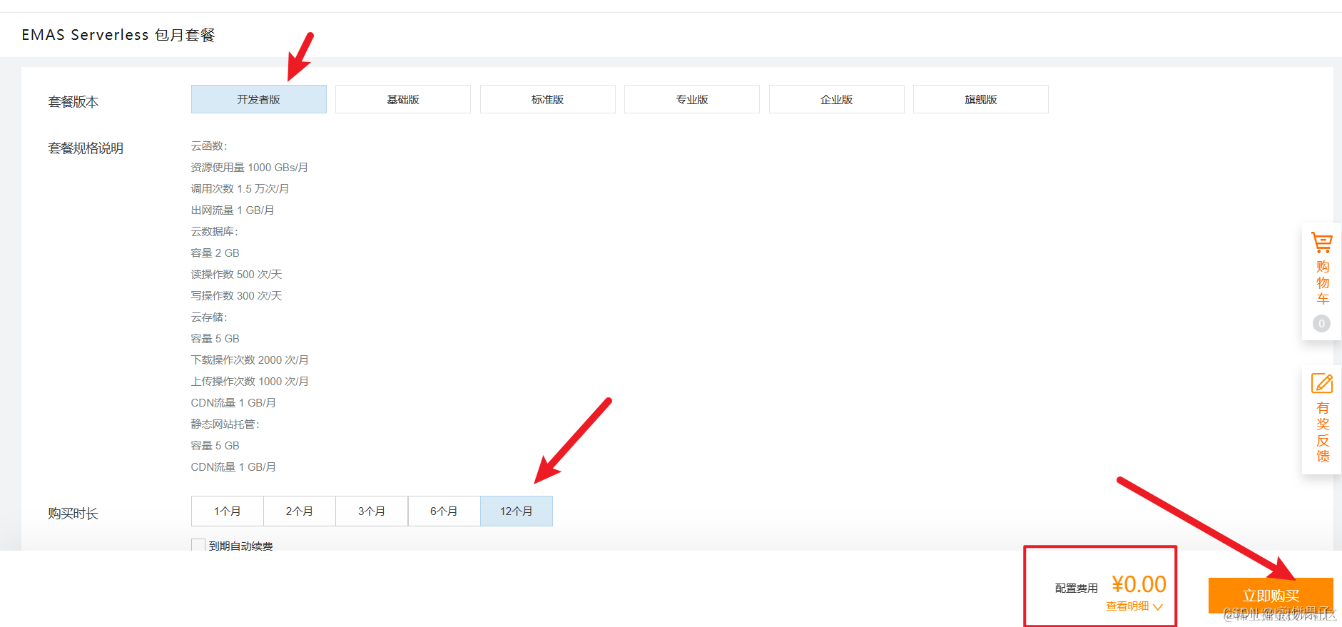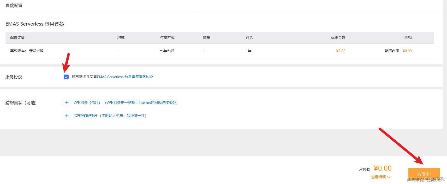 然后进行套餐的购买,勾选以下内容 (不要勾选自动续费,免费的套餐不能自动续费,如果打钩了,接下来的支付按钮就是灰色了,无法支付)