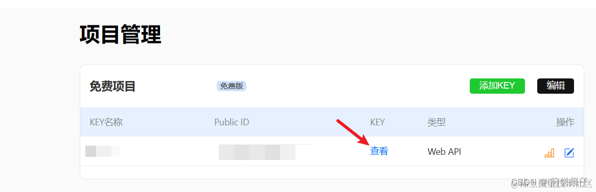 创建好后,回到项目管理页面,点击查看,然后复制key,保留备用,下面会用到