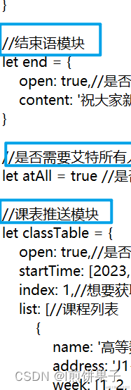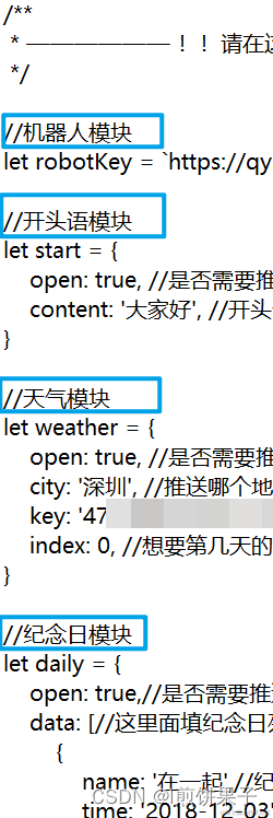 打开文件,可以看到文件中有8个模块,机器人Webhook、开头语、课表、天气、倒数日、结束语、彩虹屁模块、是否艾特所有人,分别对应下图: (机器人Webhook是用来发送消息的)