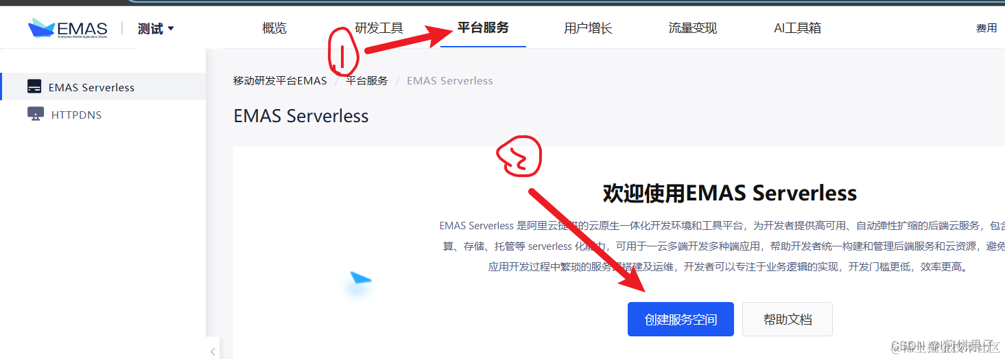 创建好服务空间后,等5-8分钟,空间构建需要时间,耐心等 (可以刷新控制台页面来判断是否构建成功 控制台页面:EMAS控制台)