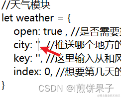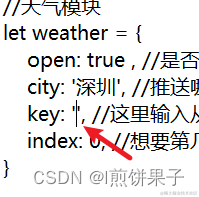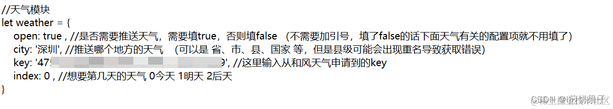 然后输入我们上面获取到的和风天气的key (在两个单引号中间输入,引号不能删掉,引号内不要有多余的空格)