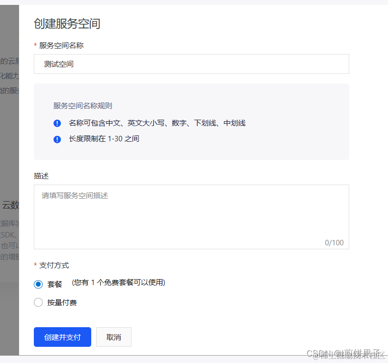 创建,记得在“支付方式”中选择 “套餐”,就能免费了(虽然按量收费也不贵,但是白嫖到底嘿嘿)