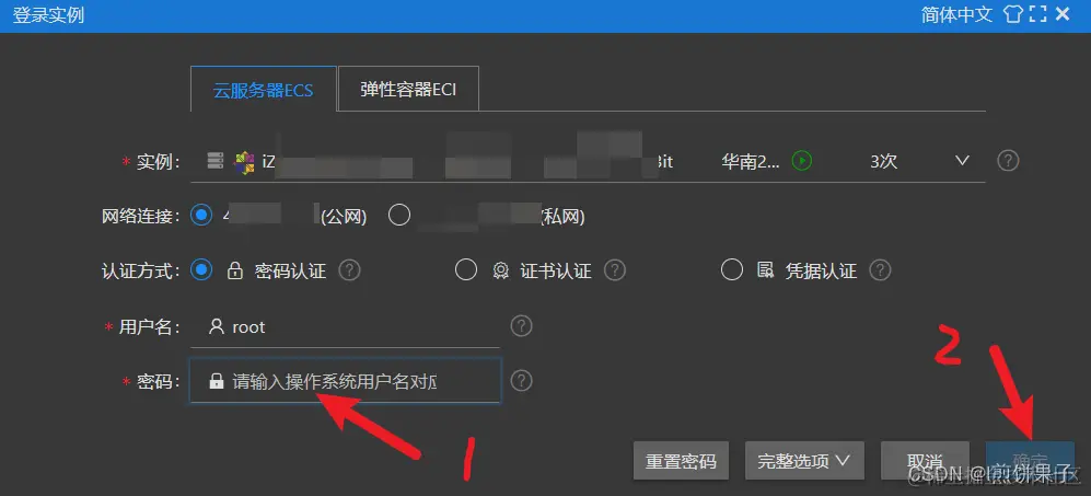 账号是创建实例的时候顺便创建的,一般是root 或 ecs-user