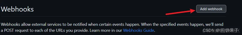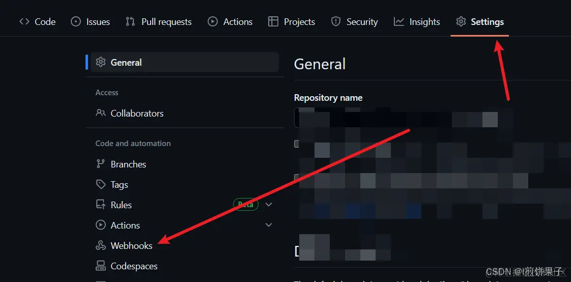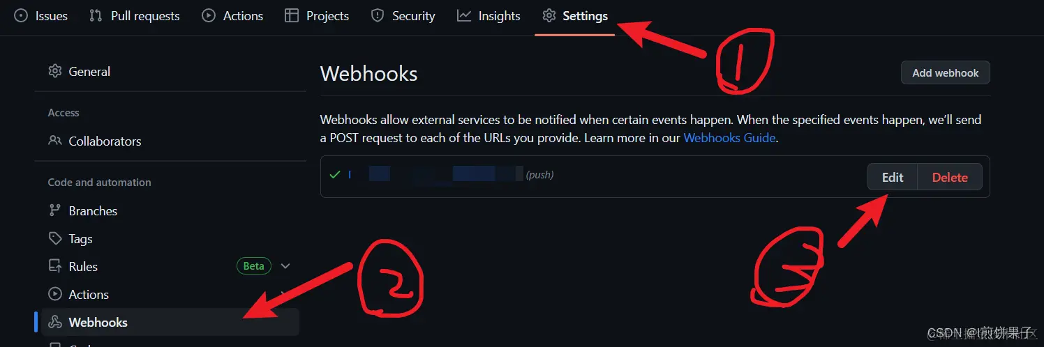 打开GitHub(gitee也可以,本文演示GitHub),打开自己的仓库,找到设置,点击“Webhooks”