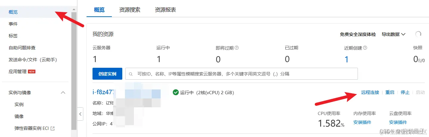 打开阿里云或者腾讯云等,进入控制台,找到你的云服务器实例,点击远程连接 。(下图为阿里云,如果你的服务商没有这个功能,可以下载MotaXterm进行远程连接,见下)