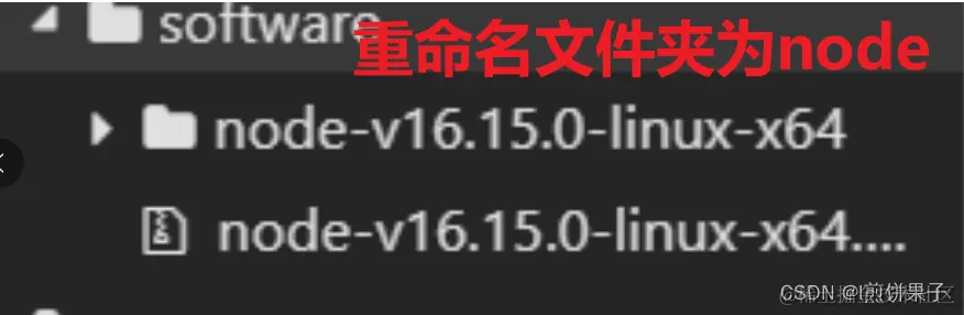 解压好后,刷新一下文件树,你就能看到刚刚下载的node了,文件夹名字是带有版本号的,右键这里,把文件夹名字改为node