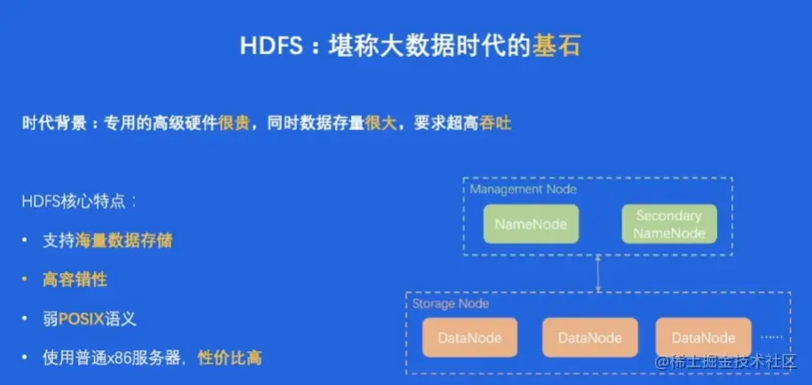 HDFS核心特点:支持海量数据存储;高容错性;弱POSIX语义;使用普通x86服务器,性价比高