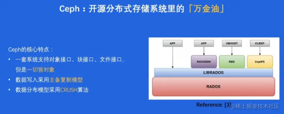 一套系统支持对象接口、块接口、文件接口,但是一切皆对象;数据写入采用主备复制模型;数据分布模型采用CRUSH算法